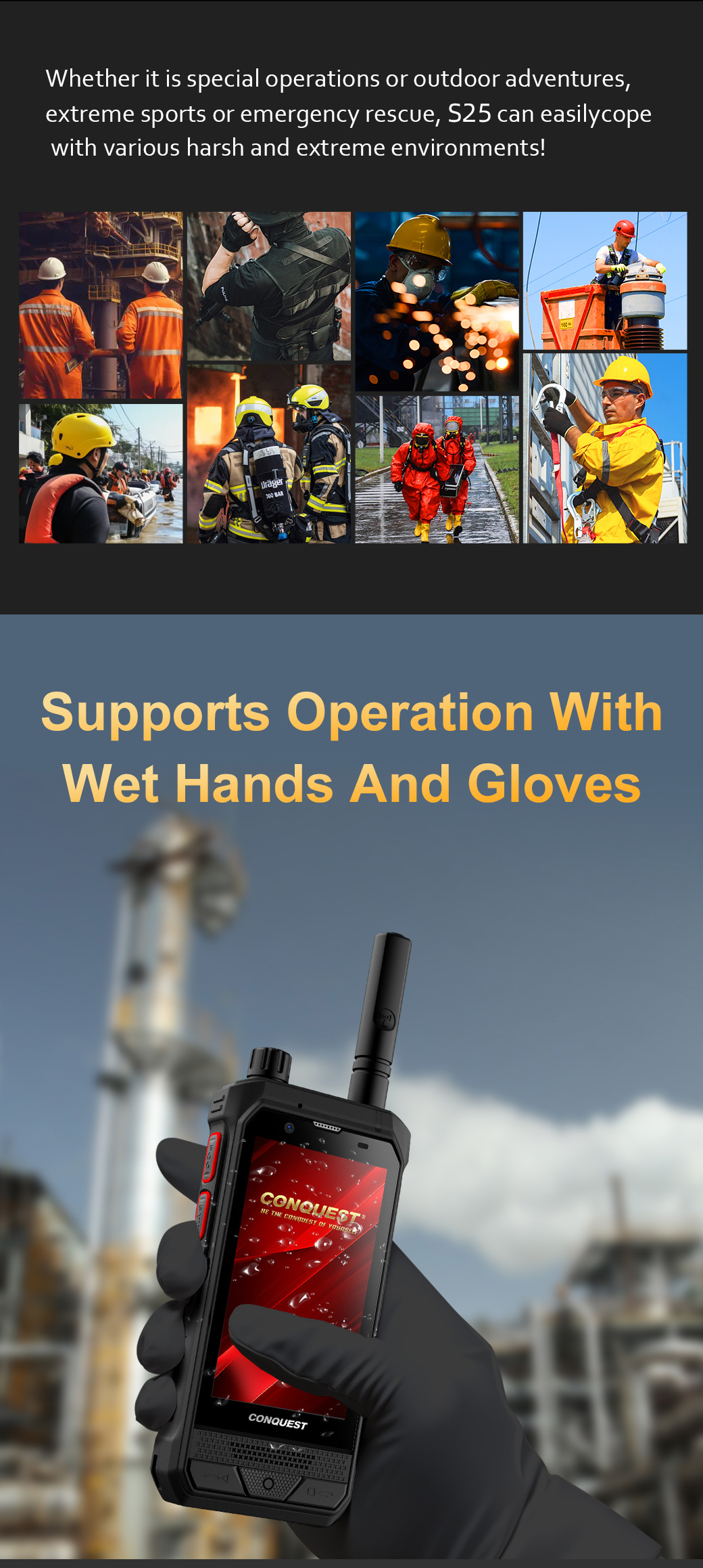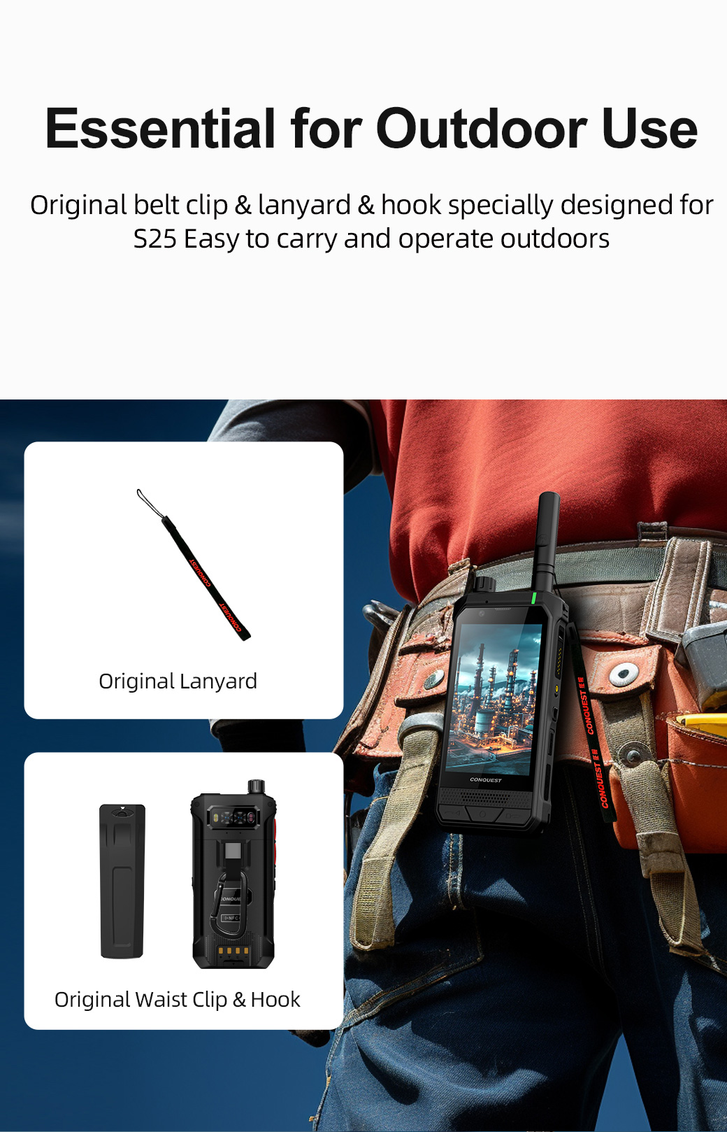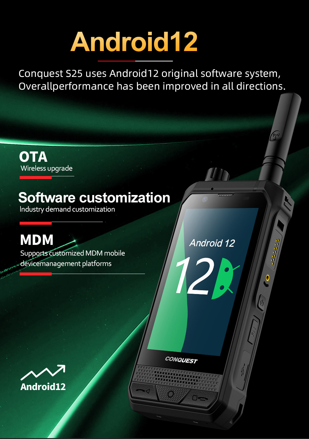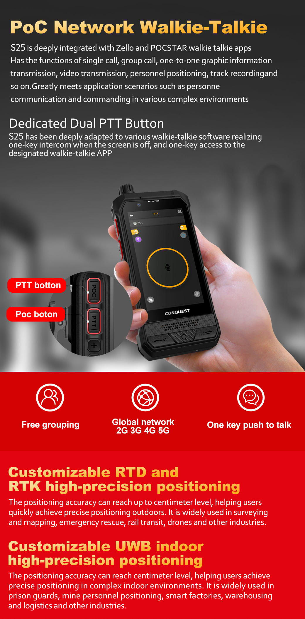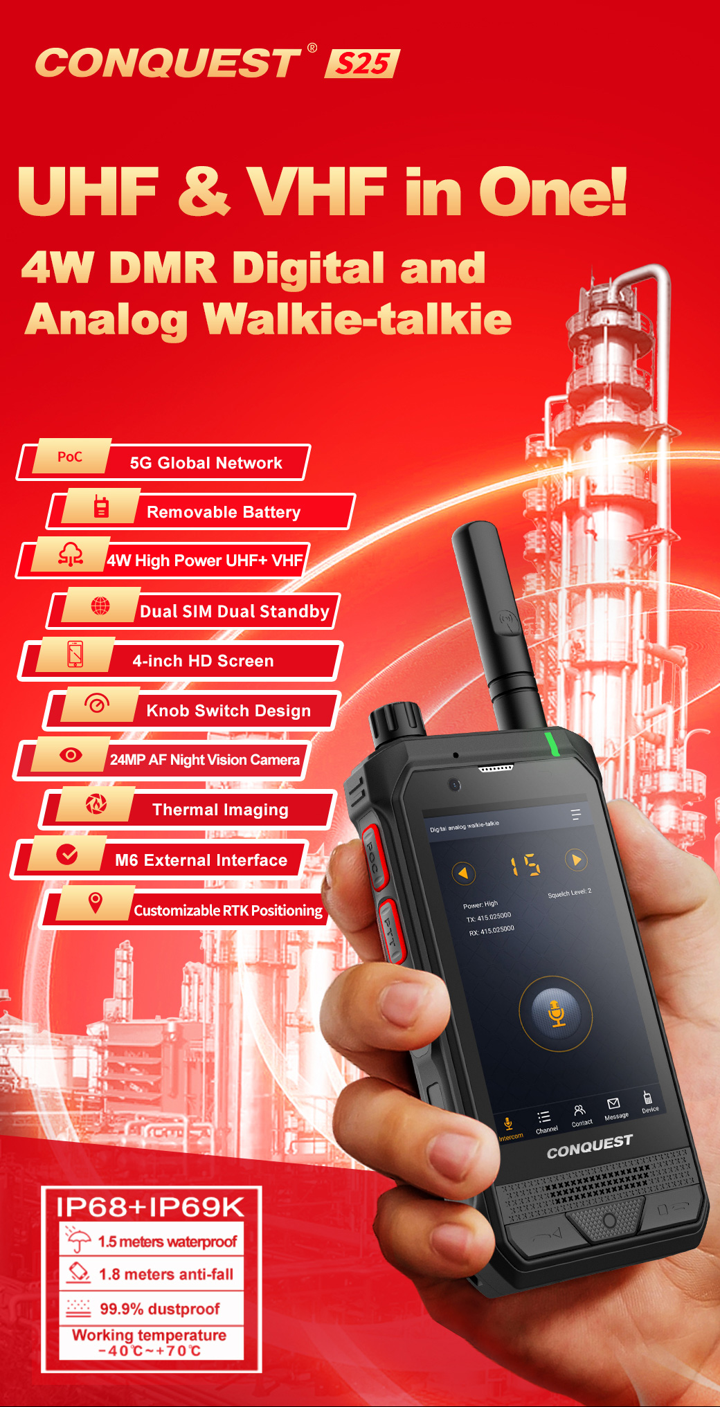 The CONQUEST-S25 is our latest developed 4W handheld terminal that supports both UHF andVHF DMR Walkie-talkie. lt features a 4-inch screen, 5G global bands, and runs on Android 12.It is equipped with a removable 3000mAh 7.6V battery, a 64MP rear camera, a 24MP night visioncamera, and a 32MP front camera, providing you with an exceptional image capturing andrecording experience.