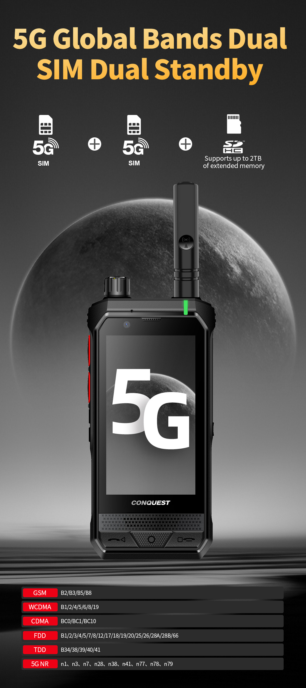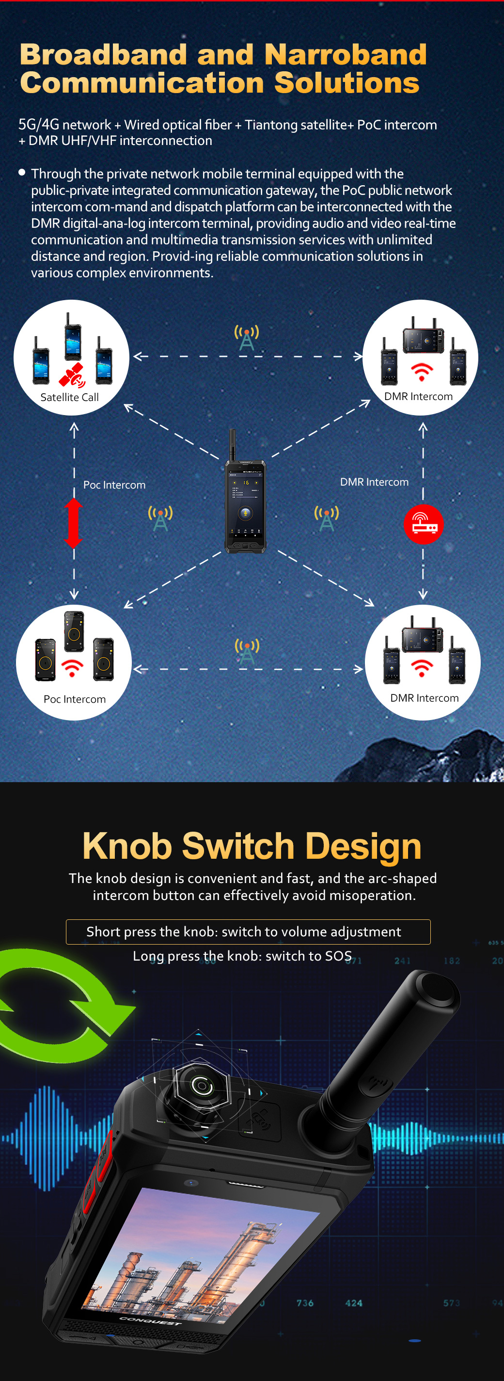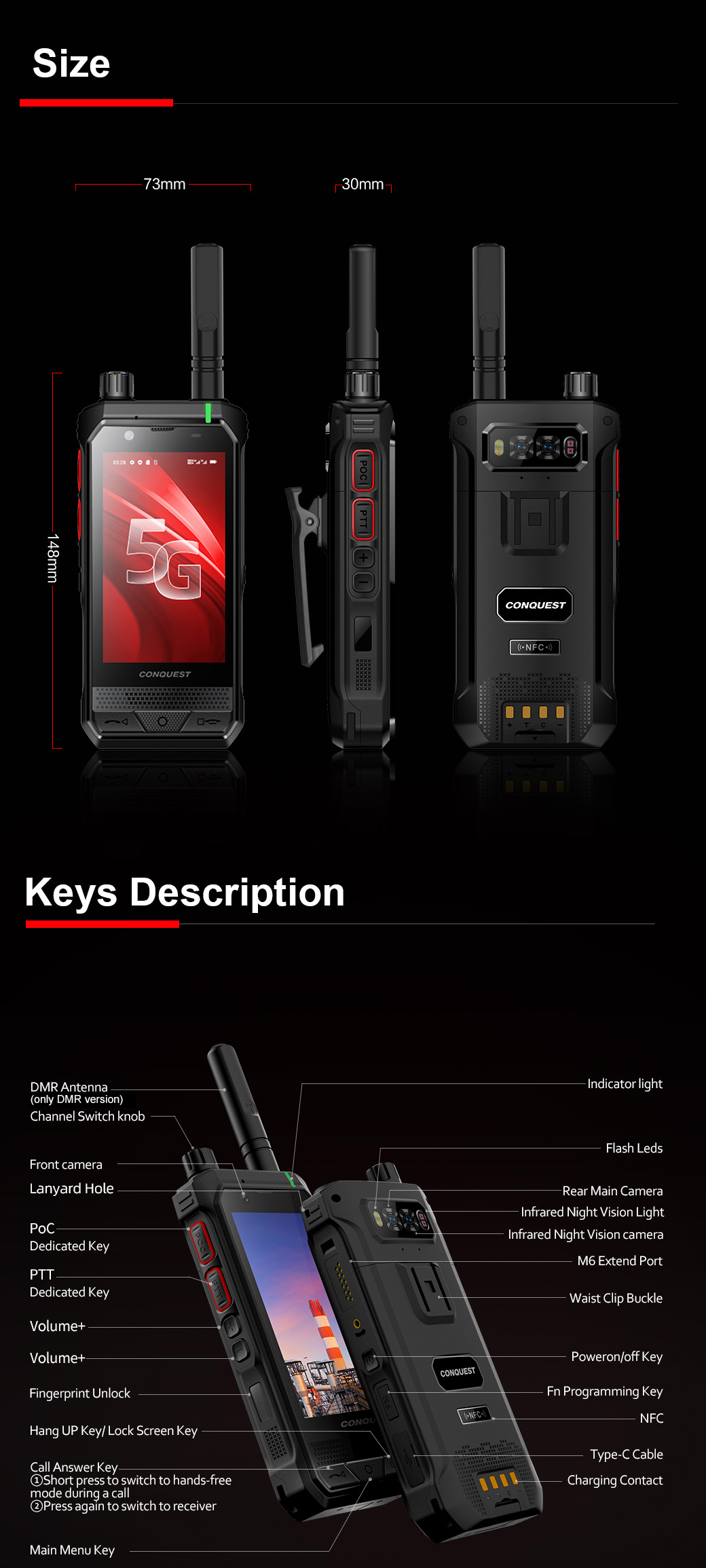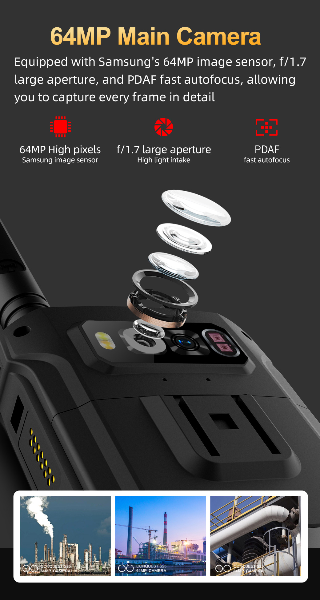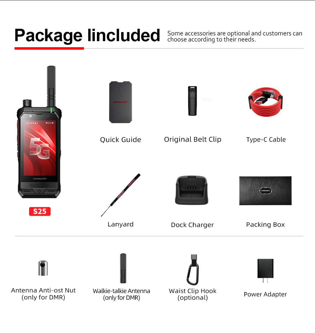 The CONQUEST-S25 is our latest developed 4W handheld terminal that supports both UHF andVHF DMR Walkie-talkie. lt features a 4-inch screen, 5G global bands, and runs on Android 12.It is equipped with a removable 3000mAh 7.6V battery, a 64MP rear camera, a 24MP night visioncamera, and a 32MP front camera, providing you with an exceptional image capturing andrecording experience.