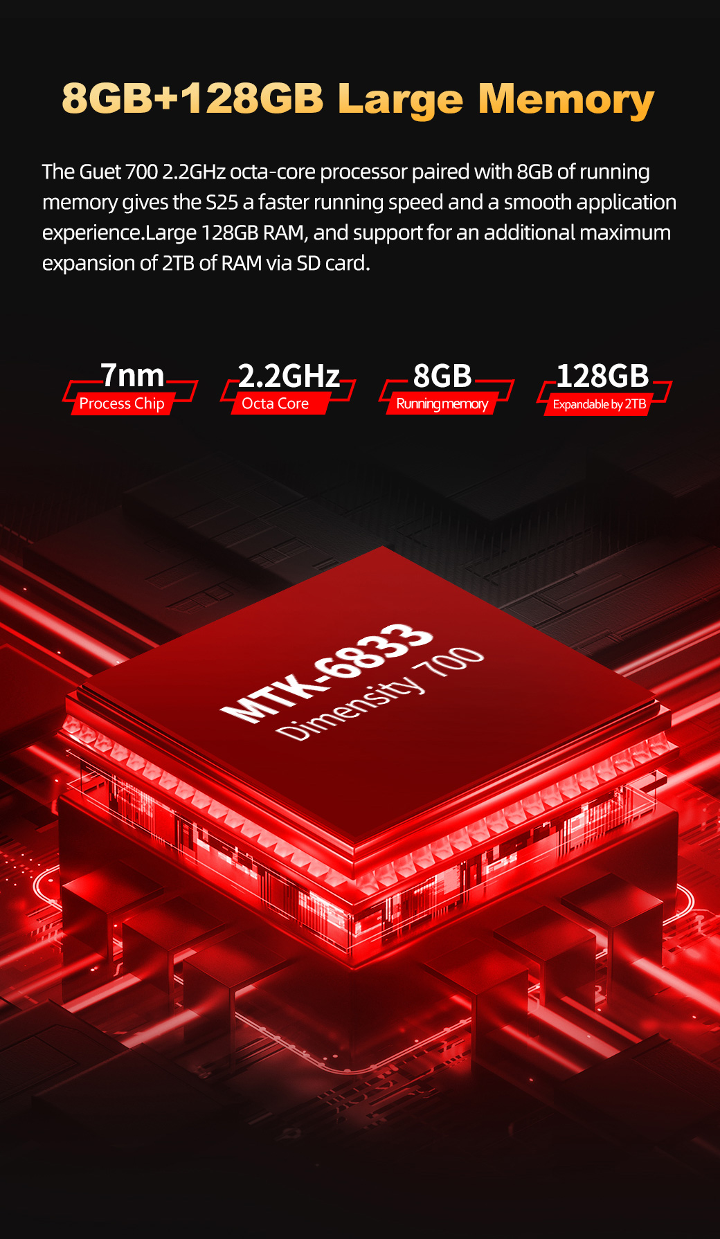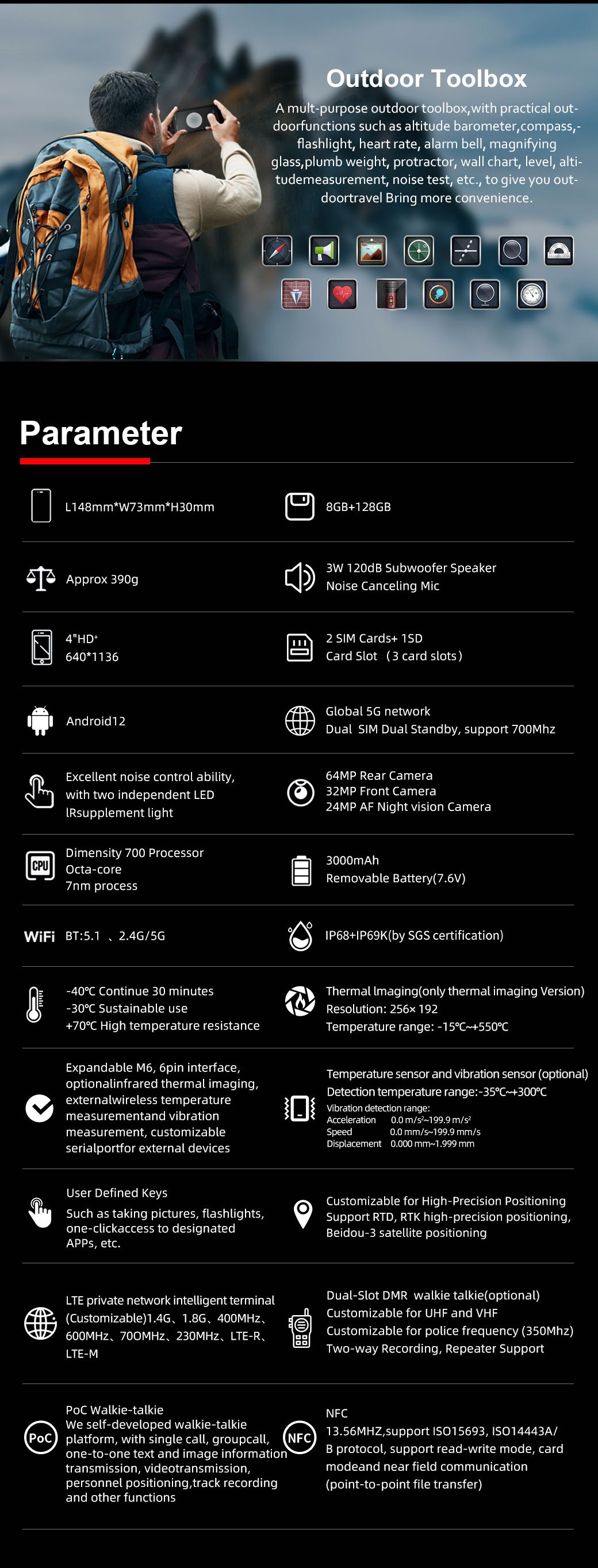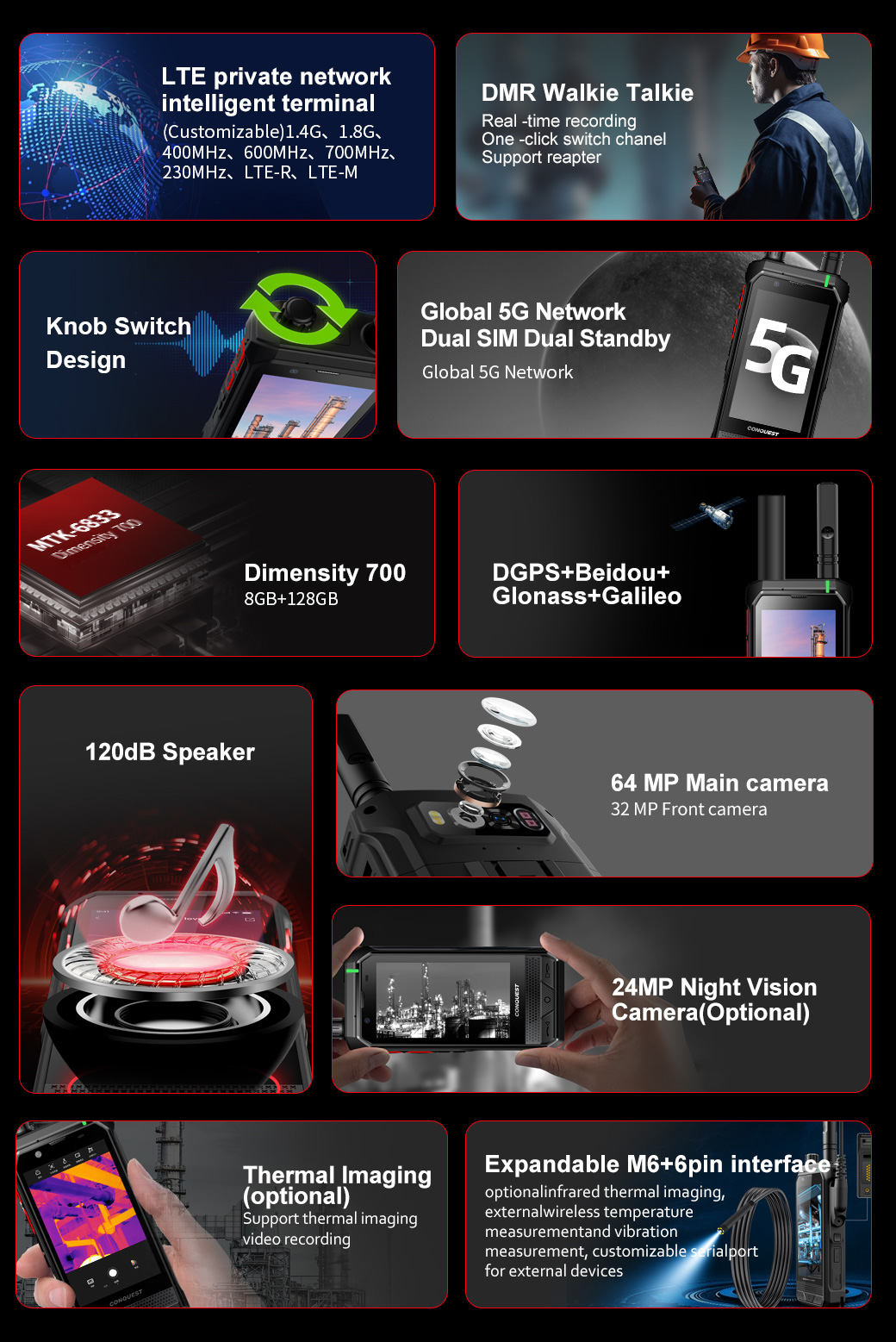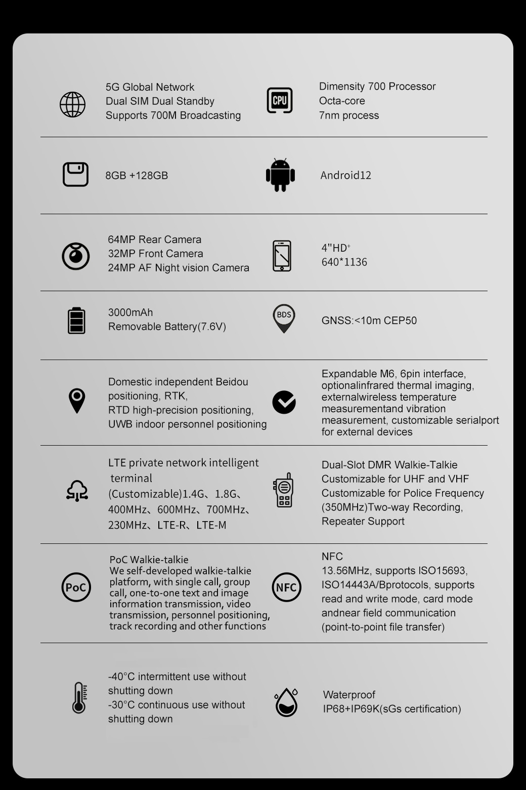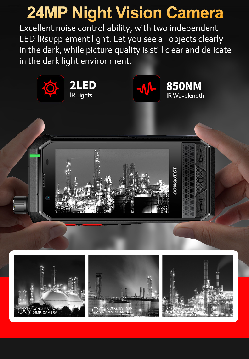 The CONQUEST-S25 is our latest developed 4W handheld terminal that supports both UHF andVHF DMR Walkie-talkie. lt features a 4-inch screen, 5G global bands, and runs on Android 12.It is equipped with a removable 3000mAh 7.6V battery, a 64MP rear camera, a 24MP night visioncamera, and a 32MP front camera, providing you with an exceptional image capturing andrecording experience.